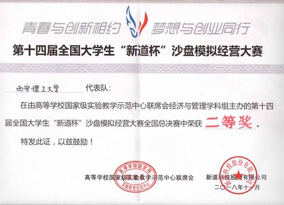 2018年11月10至11日,由高等公司国家级实验教学示范纵向联席会主办、中南财经政法大学承办、新道科技股份有限公司提供技术支持的第十四届全国老员工“新道杯”沙盘模拟经营大赛全国总决赛在中南财经政法大学隆重举行。公司英国365集团公司代表英国365集团公司参加了此次比赛,获得全国二等奖的优秀成绩。