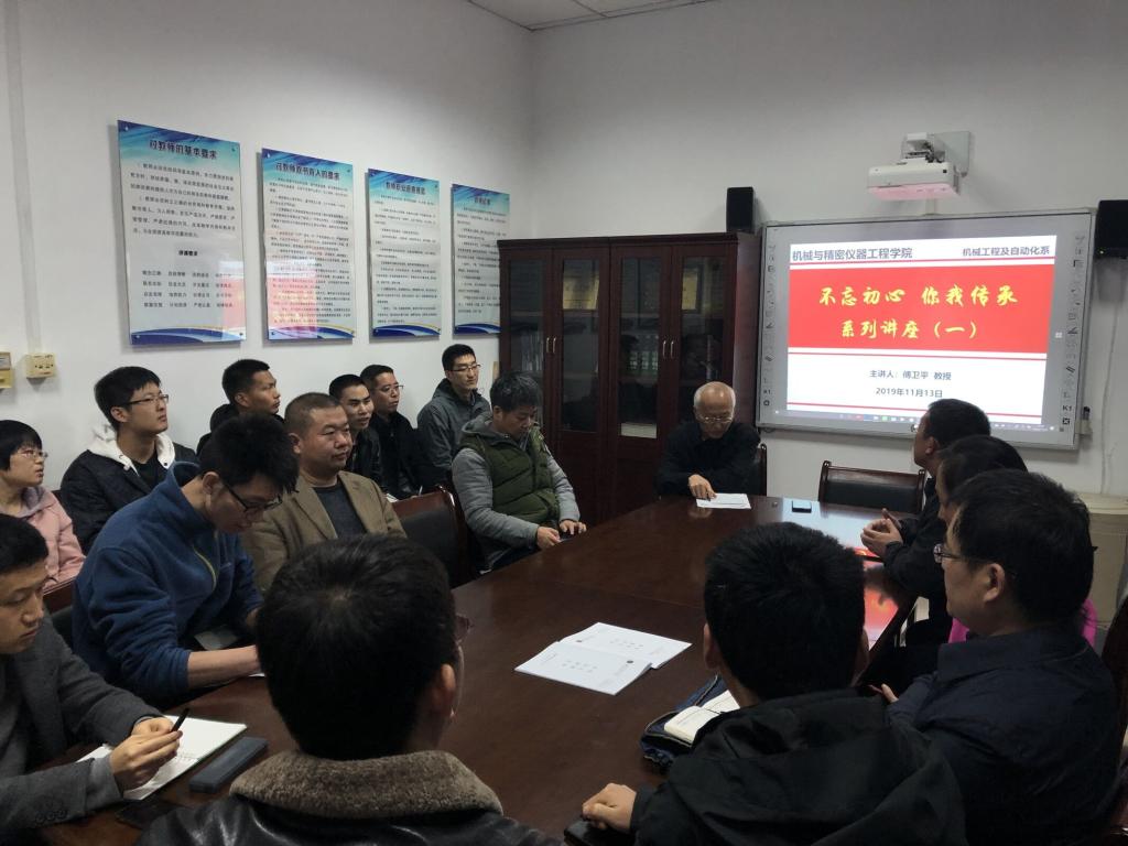 11月13日下午,机械工程及自动化系在教一楼系办公室开展了“不忘初心,你我传承”系列报告活动。本次报告主讲人是傅卫平教授,机械工程及自动化系中青年教师参加了本次活动。