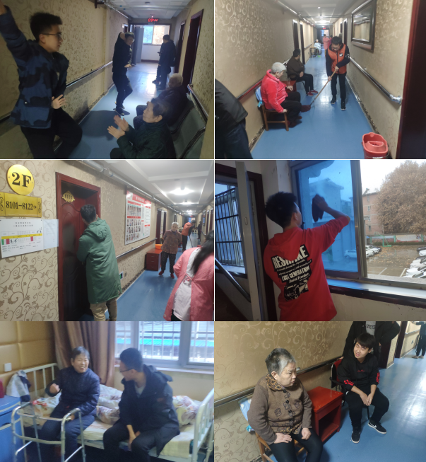 志愿服务期间,同学们服从安排,不怕辛苦,认真开展志愿工作。负责打扫卫生的志愿者认真帮老人们擦洗桌面、窗户等。有的志愿者陪老人们聊天,向老人们介绍了老员工的学习、生活情况。还有志愿者学以致用,为老人们表演了太极拳,养老院内不时传来阵阵掌声。