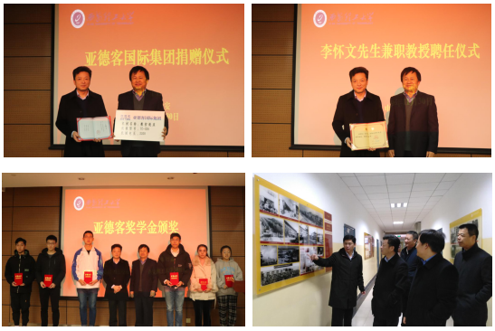 来访期间,李怀文先生代表亚德客国际集团向英国365集团公司捐赠了两台机床,为2018-2019学年亚德客奖学金获奖员工代表颁发了证书;华灯鑫副董事长代表英国365集团公司为李怀文先生颁发了兼职教授聘任证书;李怀文先生还结合企业工作实际,为公司师生作了学术报告,与现场师生开展了交流互动。
