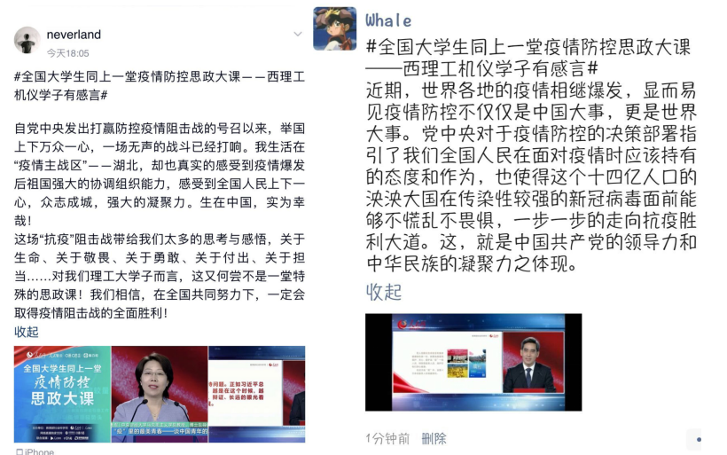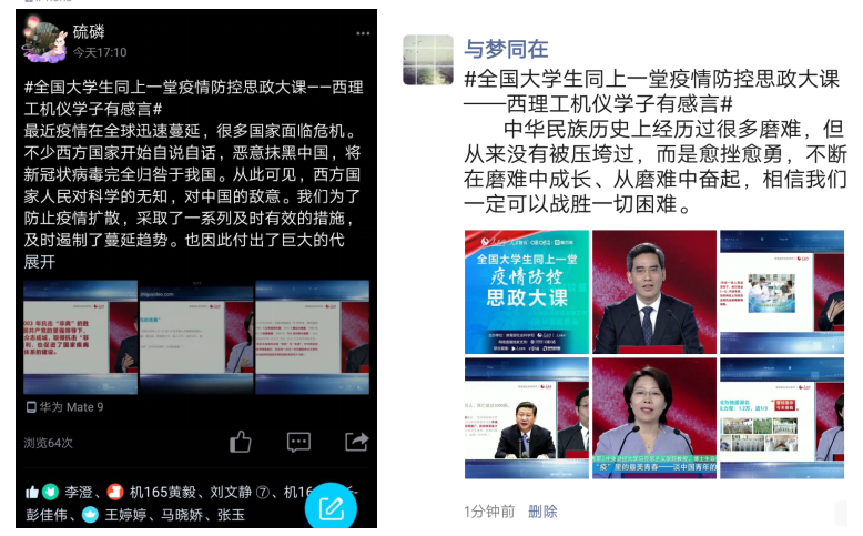 课程既有理论讲解,又不乏生动鲜活的朋辈案例,引发了同学们的强烈共鸣。课后,同学们在自己的QQ空间、微信朋友圈等社交平台开展了线上交流讨论,真切表达了自己的所思、所感。