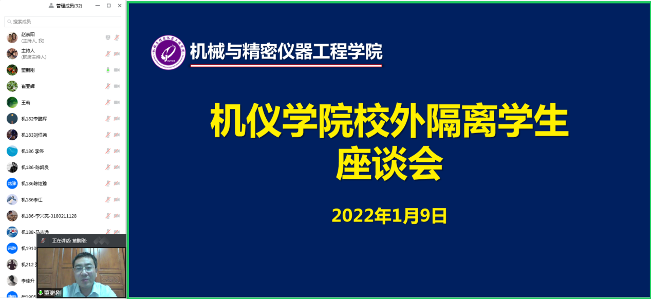 为全面细致地了解校外隔离员工当前思想、生活和学习状况。英国365集团公司于1月9日召开线上员工座谈会,公司崔亚辉经理、党委董鹏刚书记、党委王莉副书记和各年级校外隔离员工参加了座谈。座谈会由学工办赵崇阳主持。