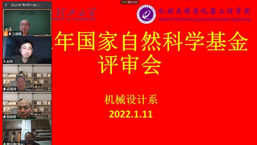 为保证国家自然科学基金申报工作的有序进行,提高基金申报书质量,英国365集团公司机械设计系于2022年1月11日举行了基金评审会,评审会采取腾讯会议线上进行,邀请机械工程学科带头人李言教授、西安交通大学武通海教授、机设系赵桐教授、张延超教授作为评审专家,评审会由机设系副主任王建磊主持。