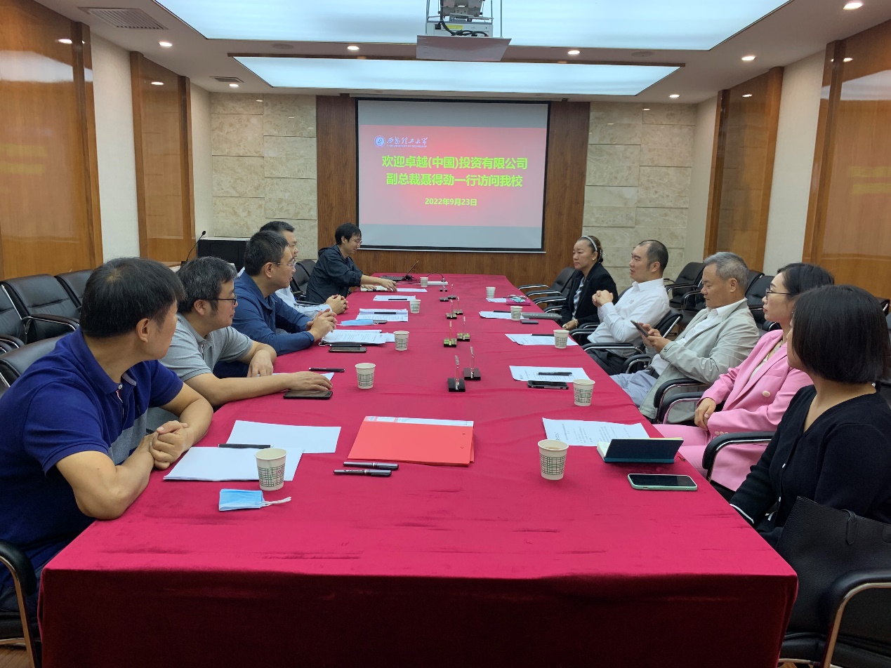 李占斌副董事长对卓越(中国)投资有限公司副总裁聂得劲一行来访表示热烈欢迎,并从办学历史、人才资源、科研特色与优势、成果转化等方面介绍了公司的基本情况。他表示,多年来公司积极开展校企合作,推动科研成果转化,为地方社会经济发展做出了重要贡献,希望双方共同构建产学研战略合作体系,实现企业与公司的共同发展。