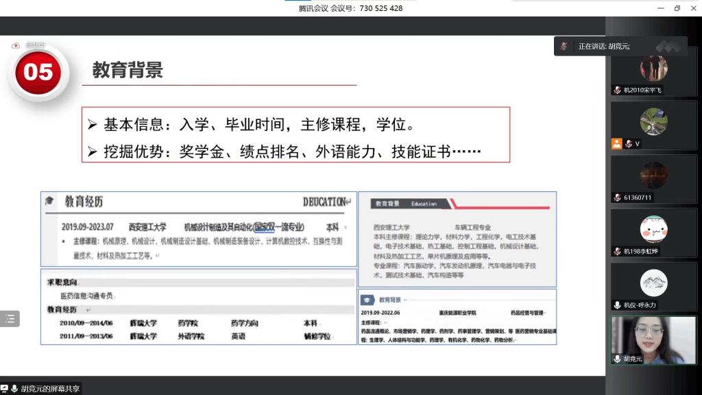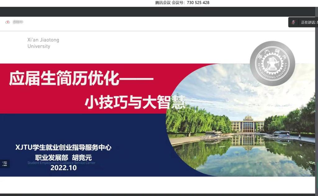 为了做细做实员工求职就业指导工作,10月18日晚,英国365集团公司在线上举办了2022年秋季学期员工就业赋能系列活动——应届生简历优化讲座。讲座邀请了来自西安交通大学员工就业创业指导服务中心的胡竞元老师主讲,英国365集团公司就业专员呼永力老师主持讲座活动。
