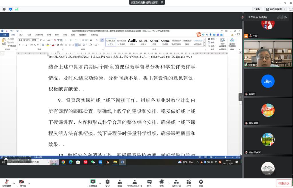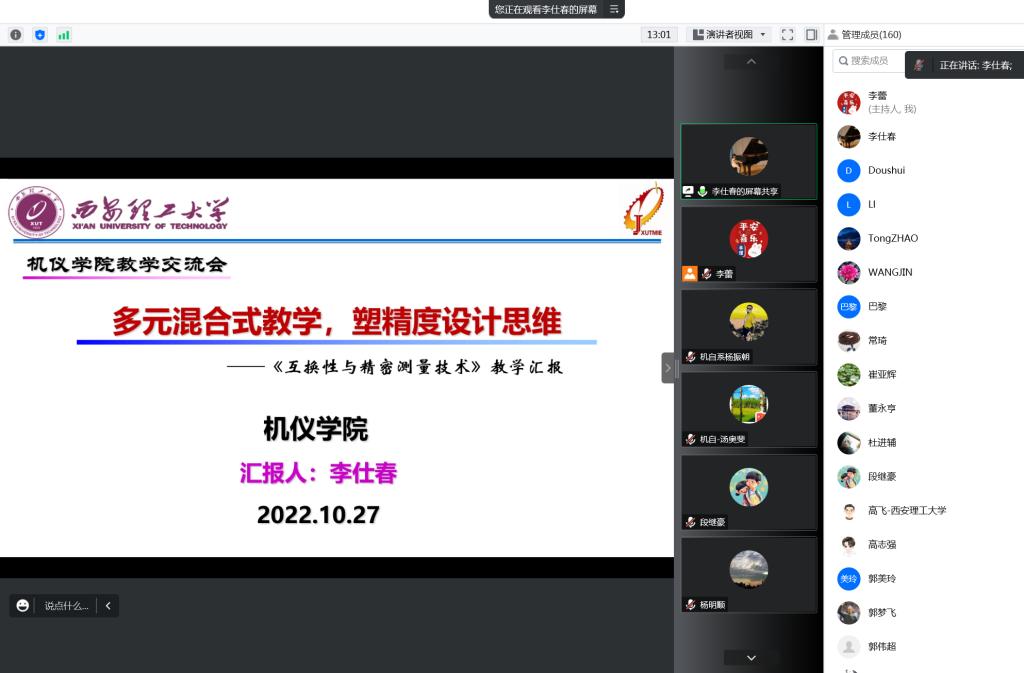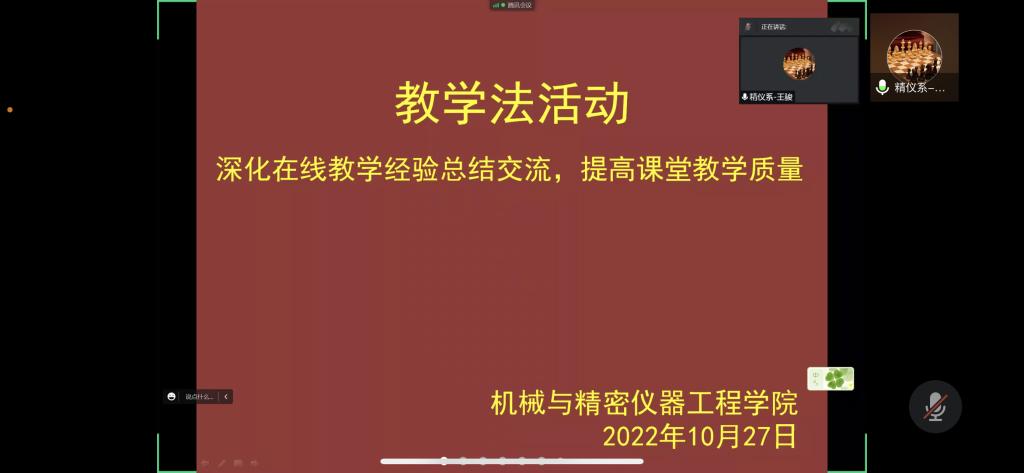 杨振朝老师以“慕课-腾讯会议+雨课堂助力在线教学”为题,向在线教师演示了如何开展线上课程教学,并用优秀的教案设计作品作了具体案例分析,使老师们对如何开展线上教学有了更加清晰和准确的认识。李仕春老师以《互换性与精密测量技术》课程为例,精选教学案例,采用“问题引导-自主思考-课堂研讨-精讲分析-总结延拓”五步骤教学模式,充分调动员工在线学习积极性。周春国老师长期讲授《机械原理》、《机械设计》及《机械设计基础》本科课程,有着丰富的教学经验。为了更好的应对线上及线下教学相结合的模式,他从公司员工学习现状、持续优化教学课件、注重线上教学效果和关注课后作业及答疑四个方面向在线教师交流了个人对线上教学的实践与思考。