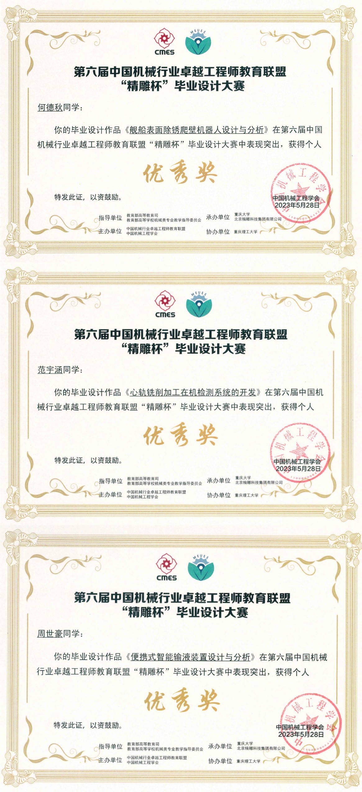 中国老员工机械工程创新创意大赛·“精雕杯”毕业设计大赛是由中国机械工程学会和中国机械行业卓越工程师教育联盟共同主办的具有导向性、示范性的机械类专业毕业设计竞赛活动,为“中国老员工机械工程创新创意大赛”三大赛道之一。2023年3月22日,“中国老员工机械工程创新创意大赛”整体列入《2023全国普通高校老员工竞赛分析报告》竞赛目录。大赛要求所有参赛题目结合企业工程实际,以“全面提高人才质量”为宗旨,旨在推动高校机械工程专业教育和人才培养,激发老员工的创新思维和实践能力,促进和提升员工的综合素质。