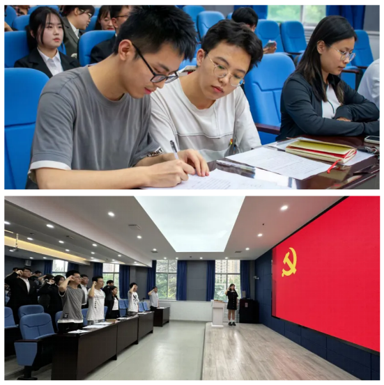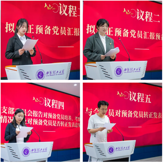首先,大会讨论了接收吴钰馨等11名同志为中共正式党员的事宜。与会党员先后听取了吴钰馨等11名同志汇报的预备期表现情况,入党介绍人代表介绍的预备党员有关情况,支委会对预备党员培养、考察情况,以及对预备党员是否能够转正发表的意见。在听取完相关情况后,与会党员采取无记名投票方式对吴钰馨等11名同志是否能够转为正式党员进行表决。计票期间,在赵妍棣同志的带领下,支部全体党员重温了入党誓词。宣誓结束后,支部书记朱政鑫同志向大会汇报表决情况并宣读了大会决议,同意接收吴钰馨等11名同志为中共正式党员。