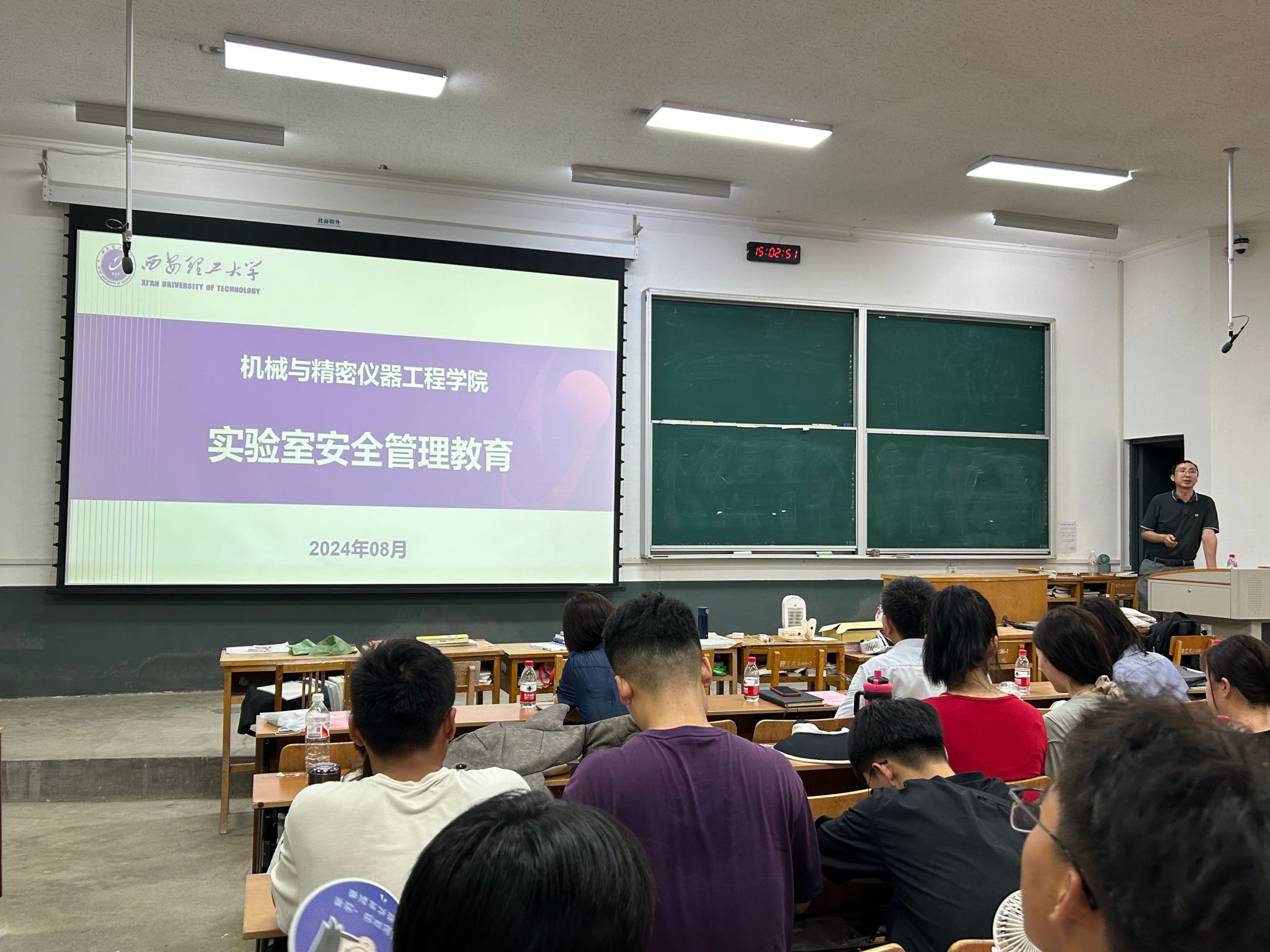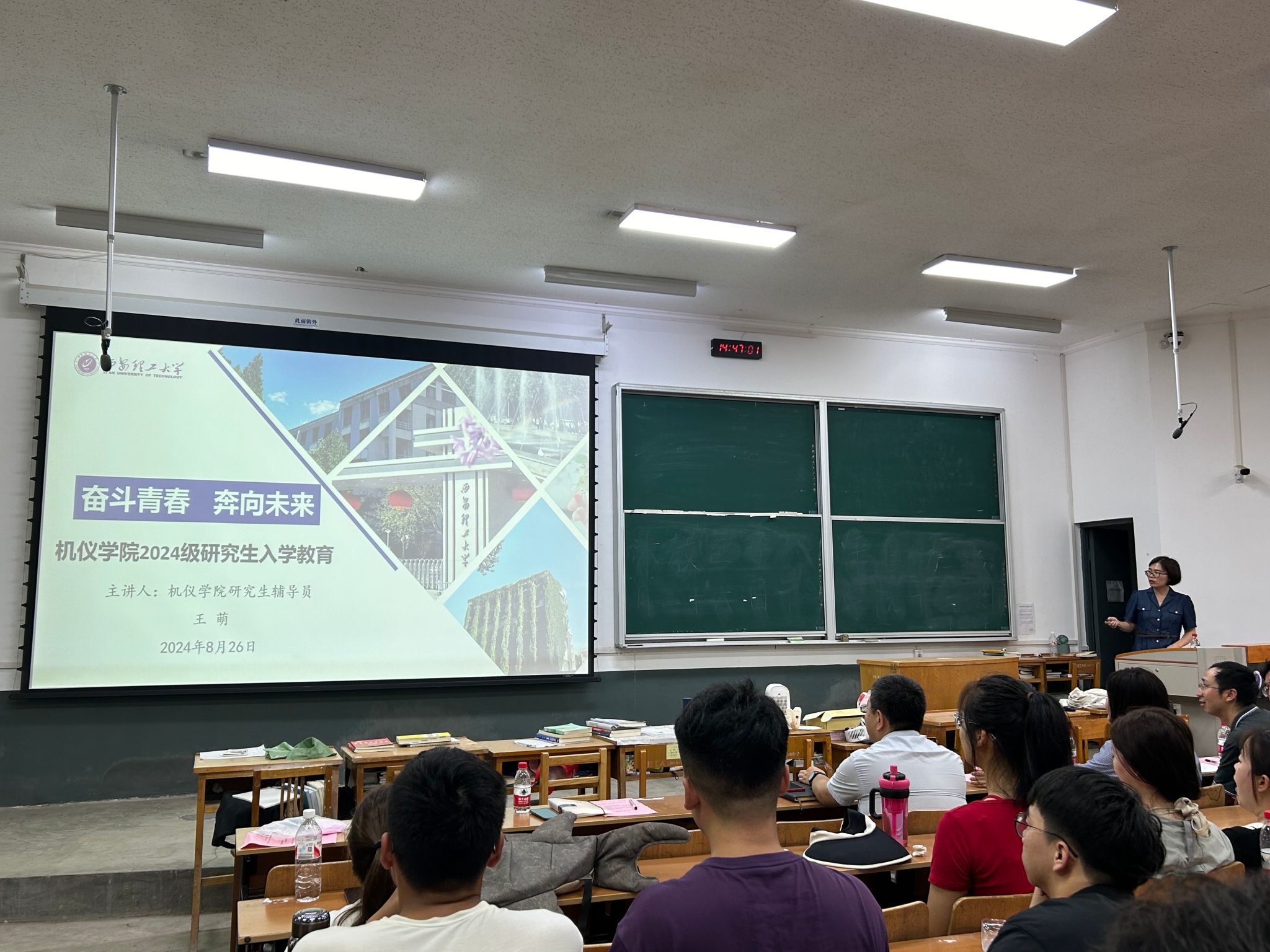 辅导员王萌以《奋斗青春奔向未来》为主题开展思想政治教育,向新生解读了请销假、违纪处分规程等日常管理文件,介绍了研究生党建、奖助学金管理等事项,并进行了安全教育与心理健康教育,引导员工以积极的心态和奋斗的姿态度过研究生时光。
